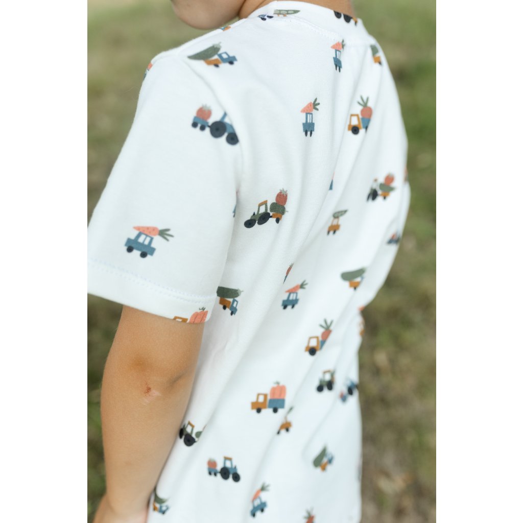 Pohodlné kojenecké body s krátkým rukávem ušité z měkké a prodyšné bavlny, která je šetrná k citlivé dětské pokožce. Na bílém podkladu zdobí body jemné vzory veselých zemědělských autíček, která převážejí zeleninu – hravý motiv, který si zamilují děti i rodiče.