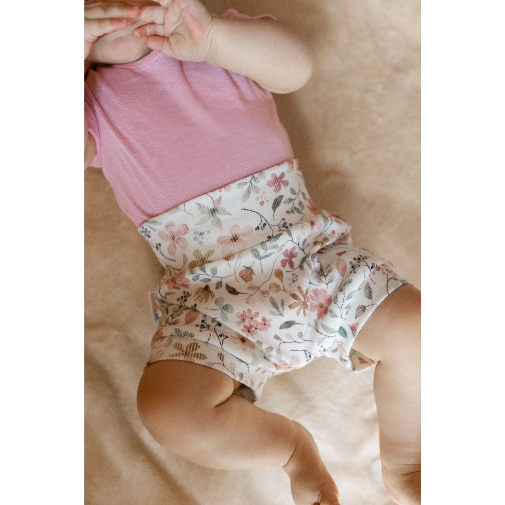 Měkké a pružné kojenecké kraťásky z žebrovaného úpletu s vysokým pasem pro pohodlné nošení a snadné přizpůsobení tělíčku. Ideální na teplé dny, kdy chcete, aby bylo miminko v suchu a pohodlí.