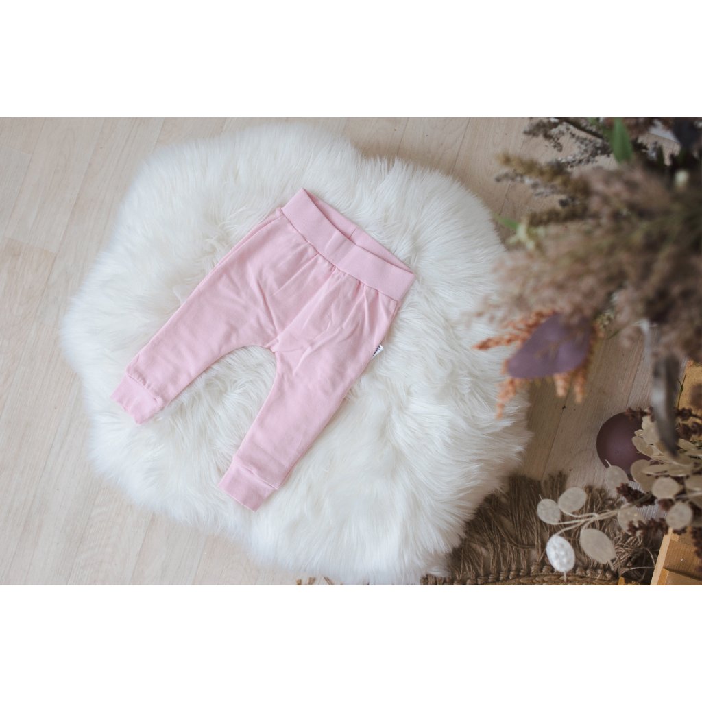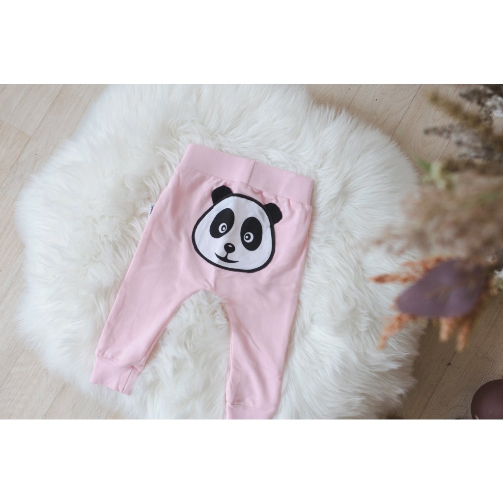 Pohodlné tepláčky v růžové barvě s ručně vytvořenou aplikací pandy na zadní straně.